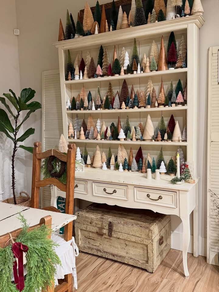 Okay, this hutch is a full-on forest, and I mean that in the best way. It’s dining room shelf decor that commits. The shelves are packed with cone trees and bottle brush trees in different sizes and colors, and somehow it still looks organized. That’s because the shapes repeat, even when the colors change. It feels festive, cozy, and slightly magical, like a Christmas village but cleaner.