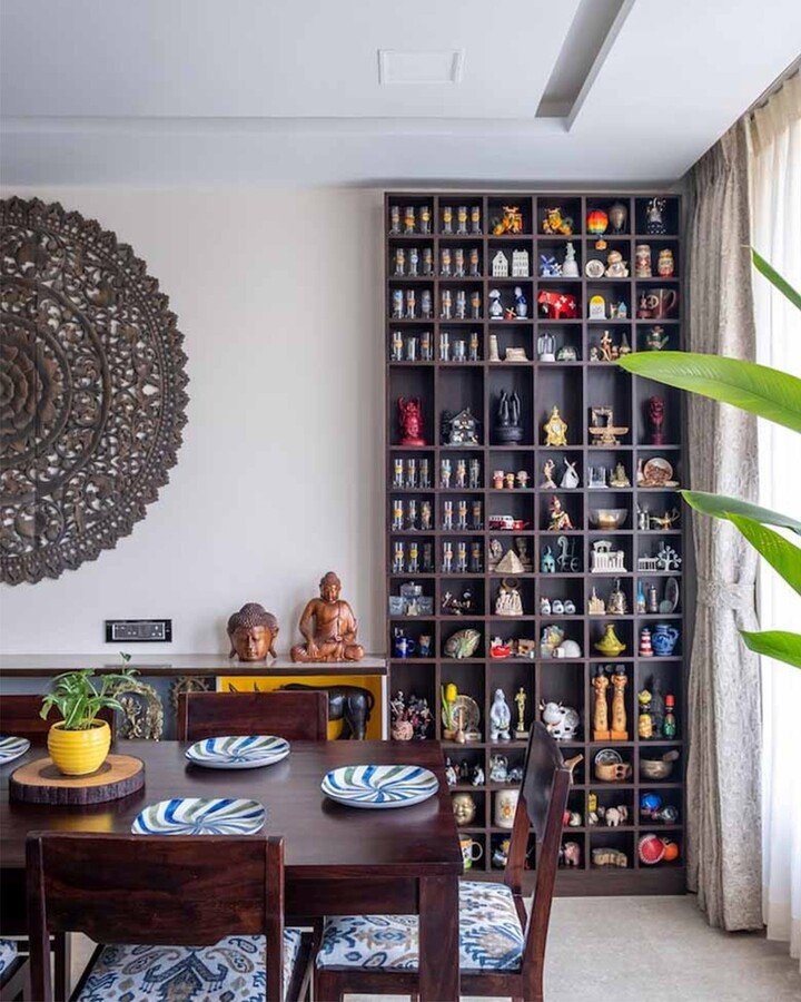 This cubby shelf wall is intense, but also kind of amazing. It’s dining room shelf decor for collectors who actually want to see their stuff, not hide it. Each little square has a tiny object, and it turns the whole wall into a gallery. I love the contrast too: the dark grid shelf against the lighter room, plus the carved wall art nearby. It feels global, personal, and a bit dramatic.