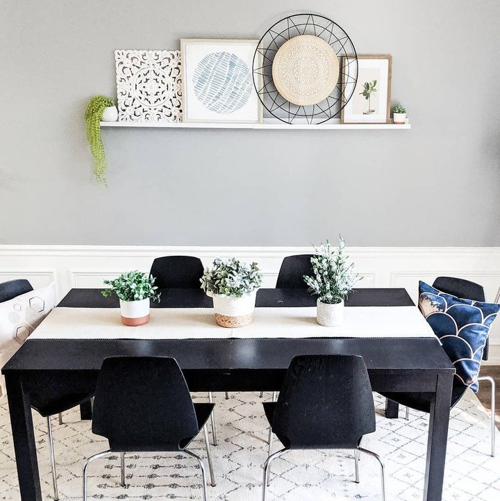 This long white ledge above the wainscoting is such a clean idea, and it’s super doable. It’s dining room shelf decor that doesn’t require a bunch of drilling or building. The layered frames, the round tray-like piece, and the little plant make a simple lineup that still feels styled. And because it’s just one shelf, it doesn’t take over the room. It gives the table space a “finished” feeling.