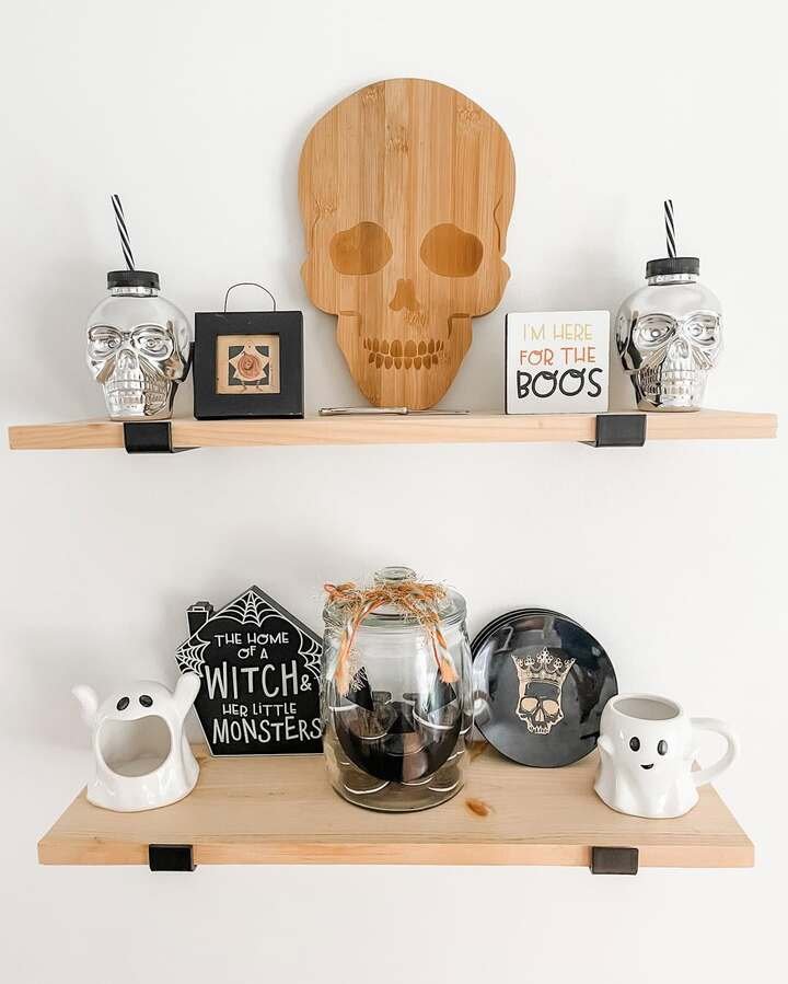 These two simple shelves with the Halloween pieces are just plain fun. The bamboo skull board is a surprise, the little signs are goofy, and the ghost mugs make me laugh because they’re cute in a slightly dumb way. I love seasonal dining room shelf decor when it doesn’t look like a store display exploded.