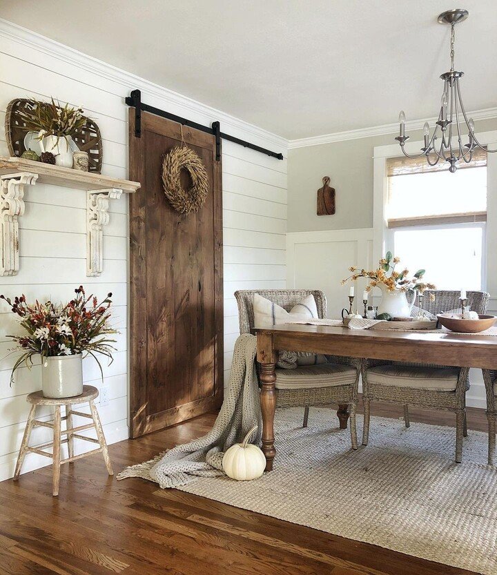 This setup is cozy and kind of dramatic, in a good way. The barn door brings weight and texture, and the shelf with the chunky corbels looks like it’s been there forever. The fall flowers and that soft throw on the chair make the room feel warm, like it smells like cinnamon even if it doesn’t.