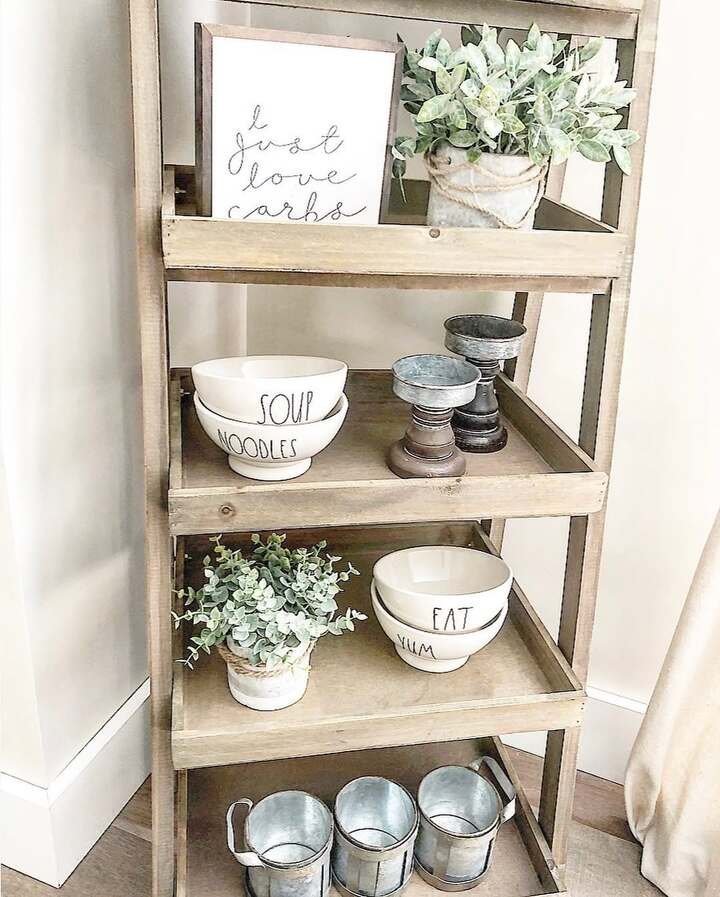 A ladder shelf is basically cheating, because it gives you shelves without needing to build anything. This one has trays, which makes it feel tidy and a little farmhouse-y. The bowls, candlesticks, plant, and those little metal buckets are simple, but it still feels styled. This is shelf decor in the dining room that also holds real life stuff.
