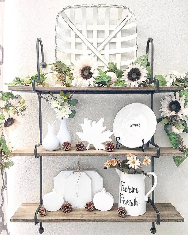 This tiered shelf with the black metal frame is a whole setup, and it works because it goes vertical. The flowers and greenery wrap around it like a soft frame, and the white pumpkins and pitcher keep it bright. It’s romantic, but still clean. This kind of dining room shelving decor is great if you like layers.