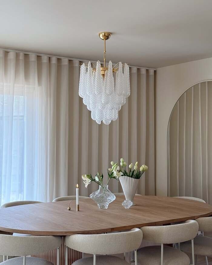 This dining space feels like it whispers instead of shouts. The curtain wall is soft, the light wood table is smooth, and that bubble-glass chandelier looks like a bunch of fluffy clouds that decided to behave. The table decor is tiny, just a sculptural glass bowl, a pleated vase, and a single taper candle. It’s basically minimal, but it doesn’t feel cold.