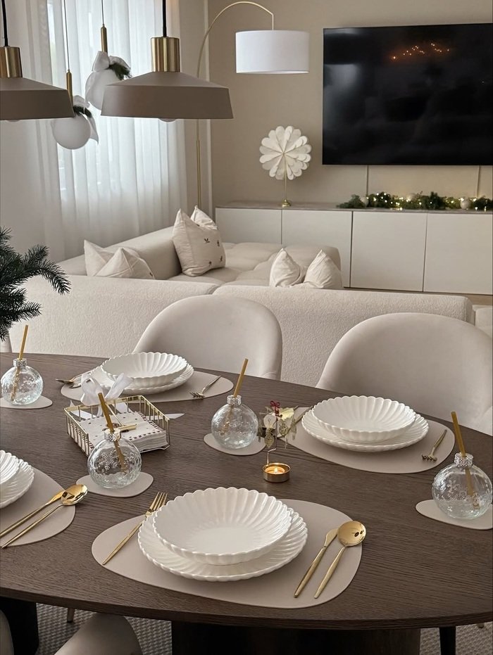 Okay I’ll confess, gold flatware makes me feel like I have my life together, even when I don’t. This setup is clean and modern: oval placemats, white ripple-edged plates, and soft beige tones. The table stays calm, but the gold details give it a tiny bit of sparkle.