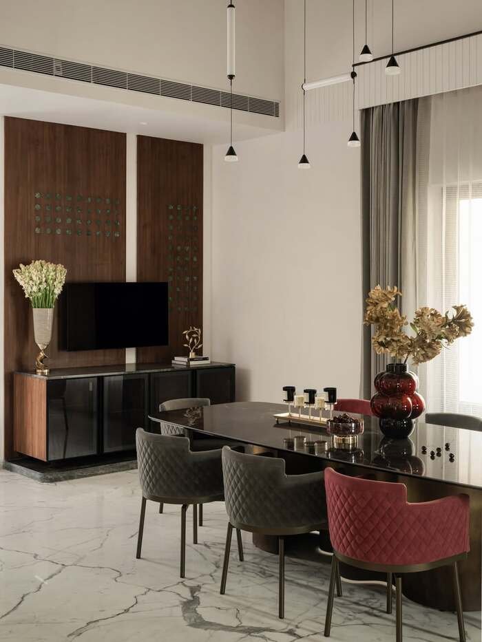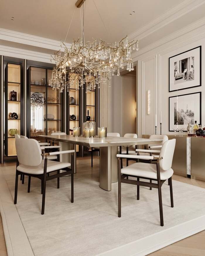 This one is straight-up formal. White walls, soft molding, a big chandelier, and a long table that looks like it hosts serious holidays. The wall decor is subtle, but the room still feels rich because of the details and lighting.