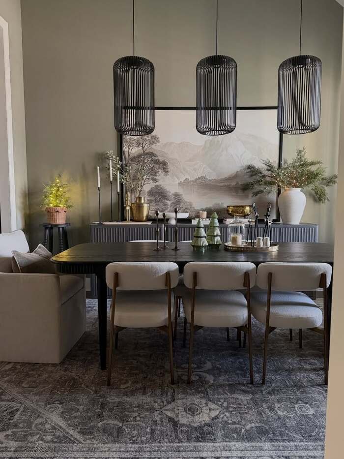 This room is darker and honestly I love it, even though I’m usually a “light walls” person. The big landscape art behind the buffet feels calm, like foggy mountains or a soft mural. With the black pendant shades, it comes off as classy and a little mysterious. It’s still dining room wall decor ideas elegant, just with a moodier attitude.