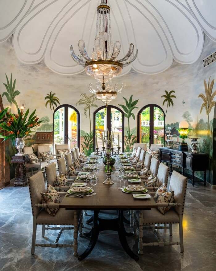 This room is wild, but fancy wild. The wall is a full mural with palm trees and a dreamy landscape, and it makes the dining room feel like a hotel. The trick is, the furniture stays more classic so the wall can do its thing without competition.
