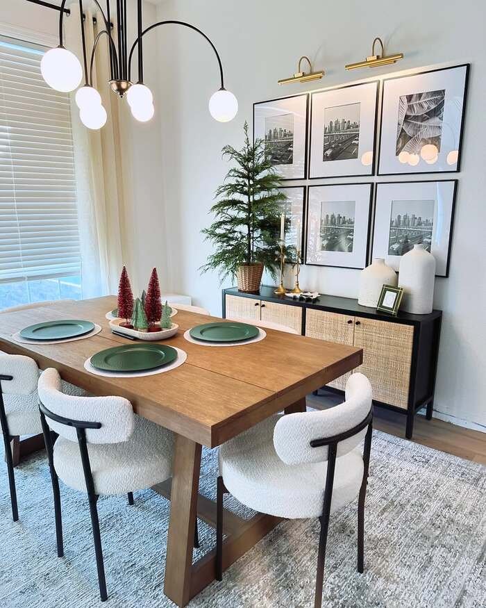 For dining room wall decor ideas elegant, a gallery grid is safer than a messy gallery wall. Measure the spacing, keep the frames consistent, and hang them centered over the sideboard. Add picture lights or slim sconces above, and it instantly looks custom.