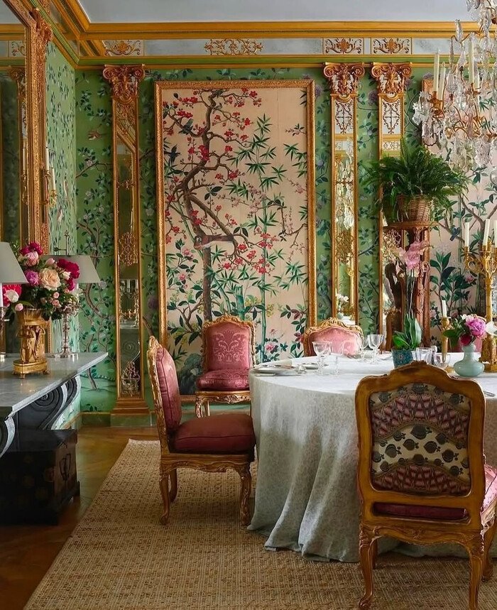 This room is not my house at all, but I still love staring at it. The wallpaper is lush, the gold trim is wild, and the framed panel in the center makes it feel like a museum room. But it’s still basically one major wall statement. So yes, it counts as dining room wall decor ideas simple in a “go big” way.