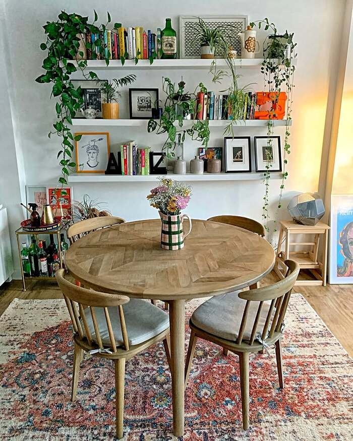 This one feels playful and modern. The big round shelf on the wall is like a giant frame, but it’s also functional. You can display cute objects, tiny art, and little plants. And because it’s one big circle, it counts as simple. That’s what I mean by dining room wall decor ideas simple. One big shape does the work.