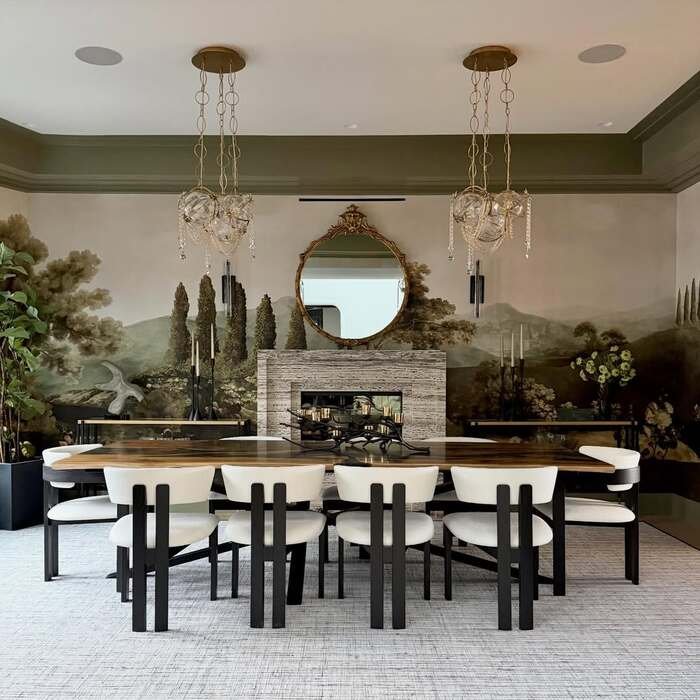 My opinion: statement lighting is basically wall decor’s best friend. It pulls your eyes up, and then your wall doesn’t have to do all the work alone. Pairing a mural wall with simple table styling keeps it from feeling too busy.