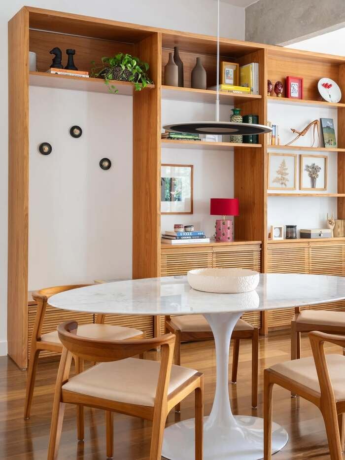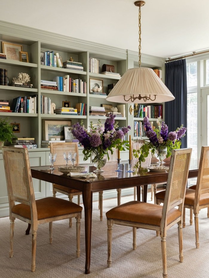 This is such a smart wall idea because it’s wall decor plus storage at the same time. The built-in shelves fill the whole wall, and the decor is basically books, a few frames, and a couple objects. That’s dining room wall decor ideas simple in a “use what you already have” way. Also, the green-ish shelf color feels calm and makes the whole room look pulled together.