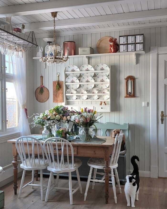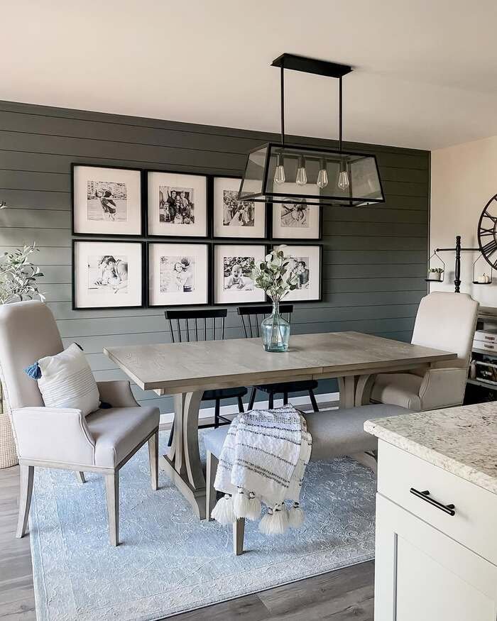 This room is so cheerful it almost feels illegal. Pink walls, a big chalkboard, a sign on top, and plants everywhere. The wall decor is still pretty simple though, because the chalkboard is one huge focal point. That’s the trick with dining room wall decor ideas simple. One big statement makes everything else easier.