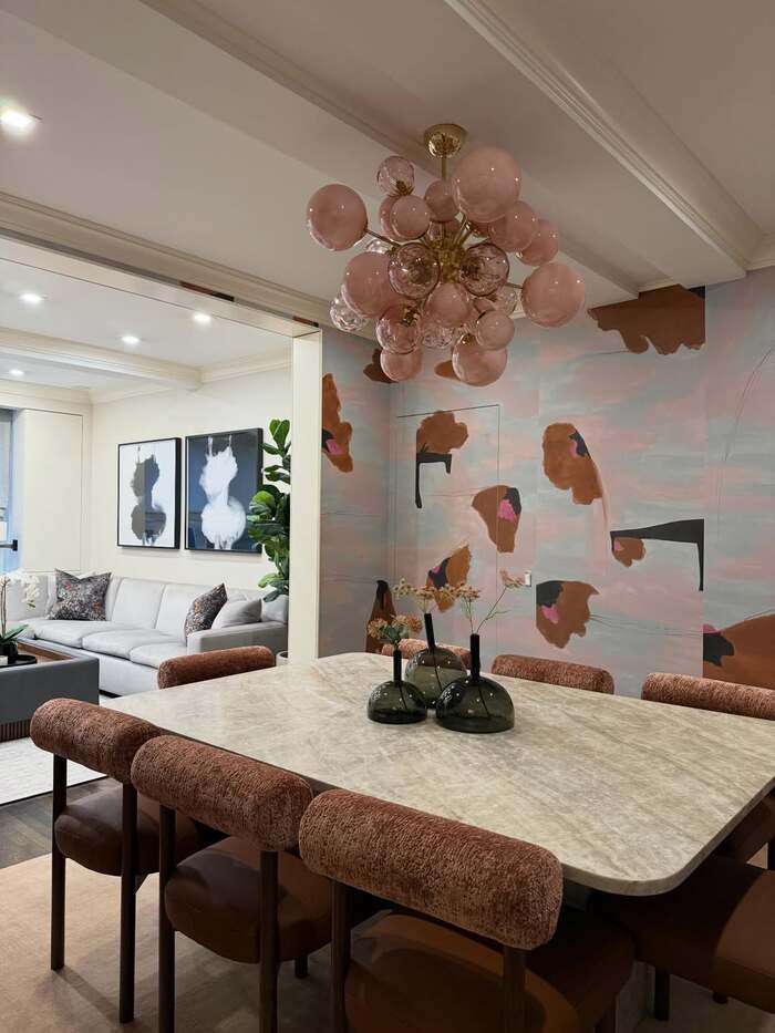 Okay this one is a mood. The wall has a mural-like pattern, and the chandelier is a big pink glass cluster. It’s dramatic, but it still follows the simple formula: one big wall feature + one big ceiling feature. That’s why it fits dining room wall decor ideas simple in a bold way. It’s not cluttered, it’s just strong.