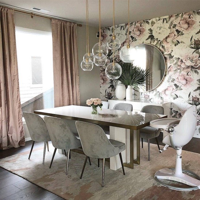 This dining room wall decor modern idea is basically a cheat code. The wall is the main moment, not the table. That big floral wallpaper turns the dining space into its own little world. And because the wallpaper is large-scale and muted, it doesn’t feel like grandma wallpaper. It feels romantic but still modern, like it’s trying, but not too hard.