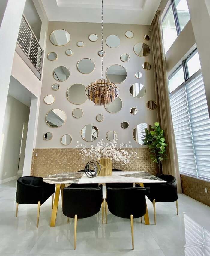 This dining room wall decor modern setup is honestly a flex. The wall is covered in round mirrors in different sizes, like bubbles floating up the wall. And because the ceiling is super tall, the mirrors don’t just decorate, they stretch the room visually. It makes the space feel bigger, brighter, and kinda glamorous without needing framed art everywhere. I love how the mirrors catch light from the windows and bounce it around. It’s one of those things that looks expensive even if it’s not.