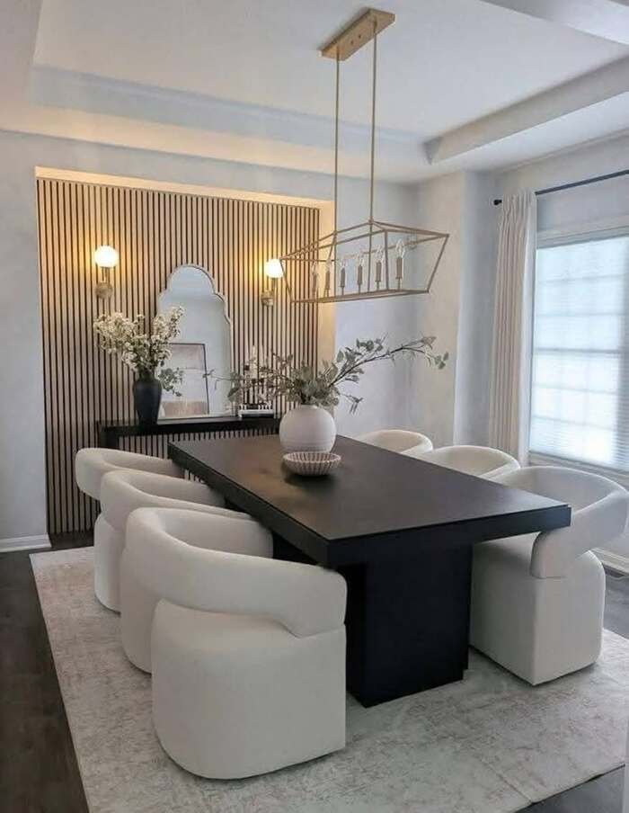 If you want to copy this modern dining room wall decor, focus on three things: texture, symmetry, and soft lighting. The slats give texture, the two sconces give symmetry, and the warm bulbs give that cozy mood. And notice how the wall decor isn’t fighting the table. The table is dark and simple, the chairs are creamy and plush, and the wall is the pretty background.