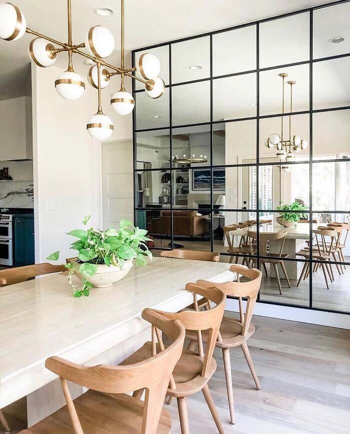 The grid style is key. The black lines give structure and make the mirror feel architectural, not like a random mirror from a hallway. In modern dining room wall decor, structure matters. The mirror becomes a statement wall without using color or clutter.