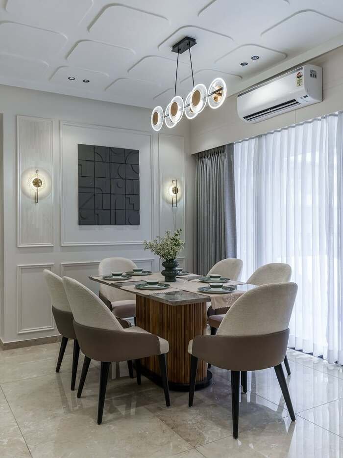 If you copy this, keep your table setting minimal. White plates, simple centerpiece, and let the lighting and wall pattern do the work. Also, make sure your curtain color is soft, like blush or taupe, so the room stays cohesive.