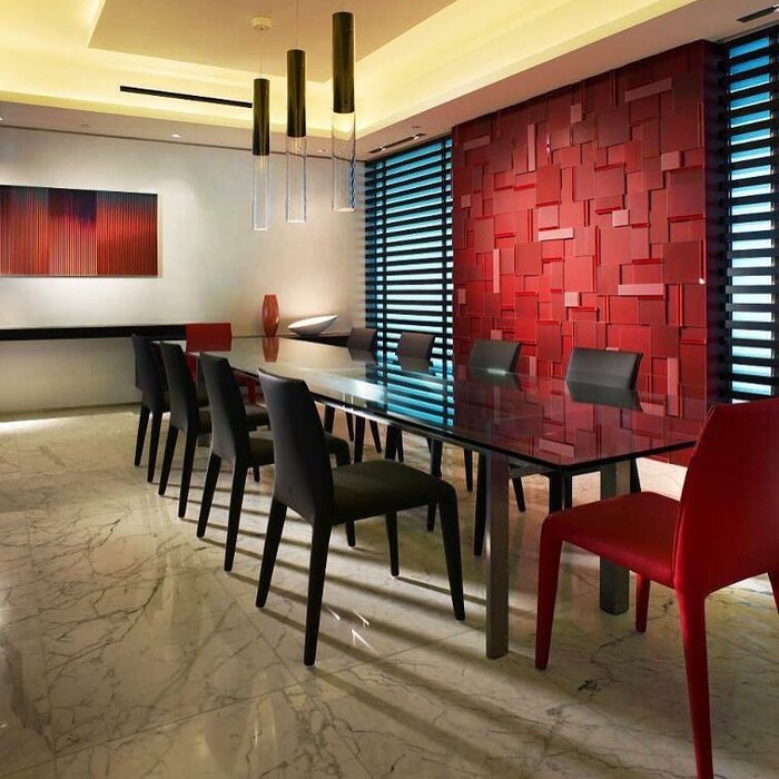 Okay this dining room wall decor modern idea is NOT for people who want subtle. That red 3D wall is loud, sharp, and kind of amazing. It turns the dining room into a statement space. It feels like a modern hotel or a cool office lobby, but in a home way. The wall basically becomes art.