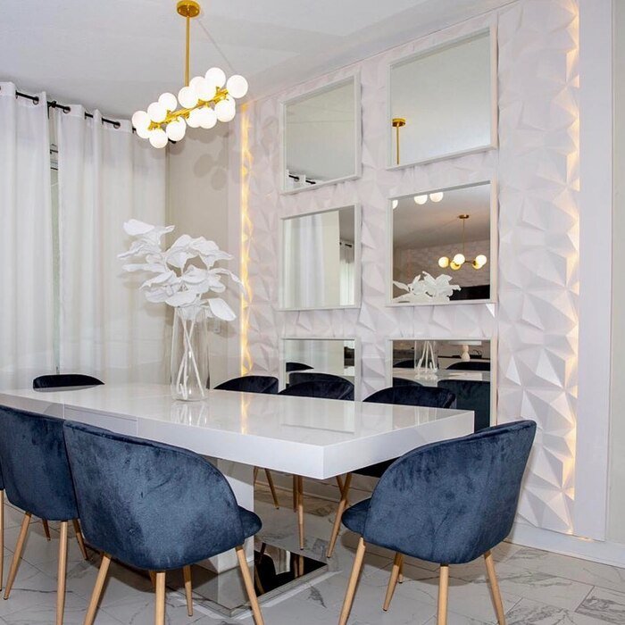 This dining room wall decor modern idea is like a whole optical illusion. The wall has geometric texture and then mirror squares arranged in a grid. It reflects light in little bits, like a subtle sparkle, but still modern. I like it because it feels fancy without being too traditional.
