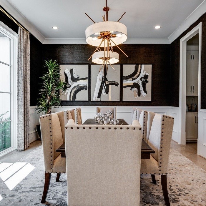 This dining room wall decor modern setup has that bold contrast that makes the table feel powerful. The wall is dark, and then there’s a set of three large abstract art pieces lined up. It’s simple but strong. The chandelier is modern and sculptural, and the whole room feels like a grown-up space.