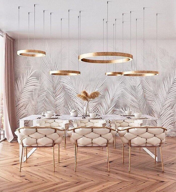 9) Palm wallpaper wall with gold ring pendant lights for a soft-lux modern look