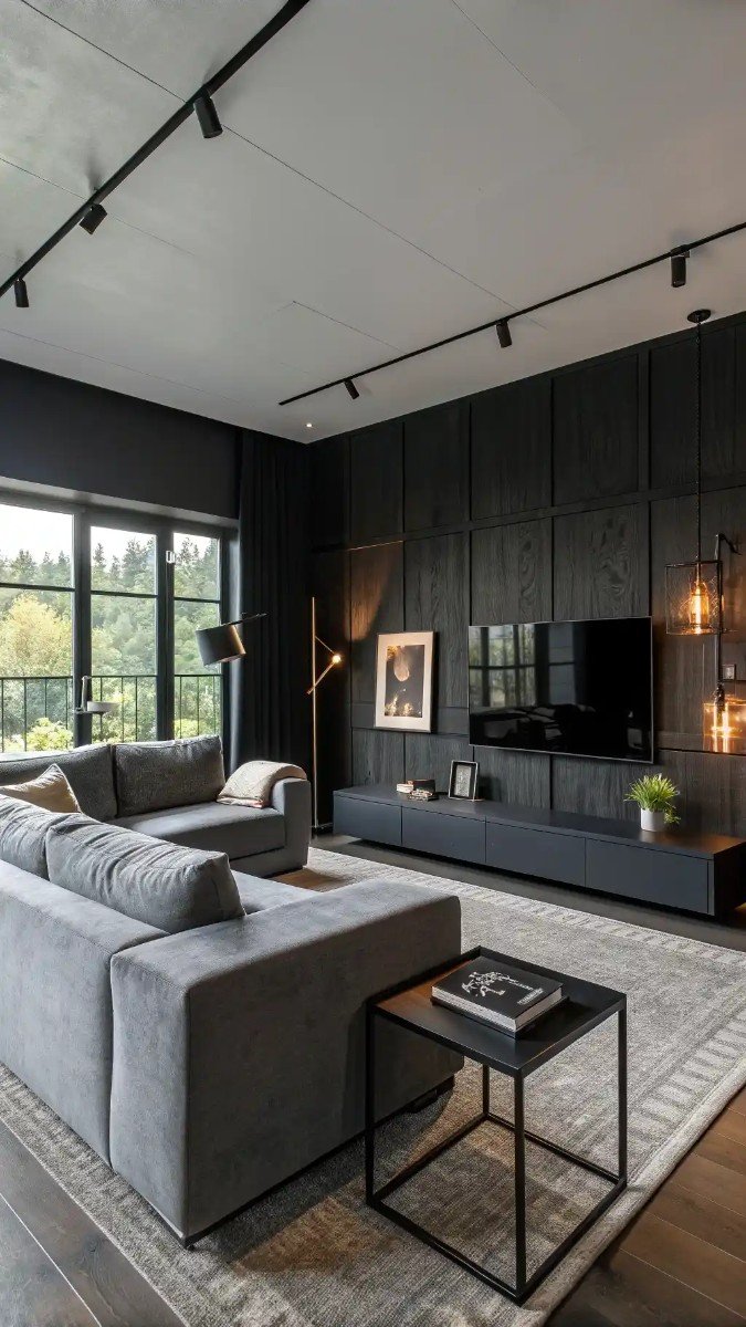 And for those seeking grey sofa living room ideas colour schemes that are anything but bland, consider this: the texture of the dark wood paneling adds depth, and the subtle warmth from the lighting fixtures prevents the grey and black from feeling cold. It demonstrates a thoughtful and intentional approach to interior design.