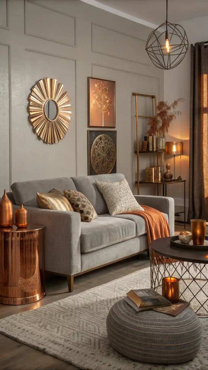 Elevating Your Grey Sofa with Warm Metallic Hues