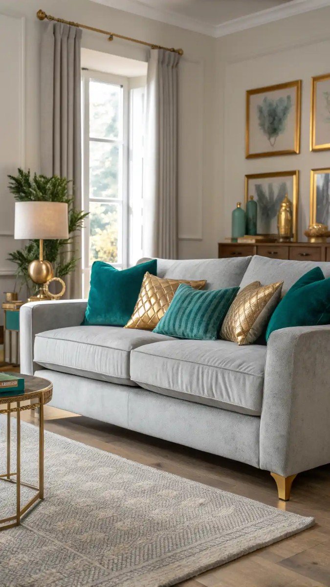 Elevating Your Grey Sofa with Teal and Gold Accents