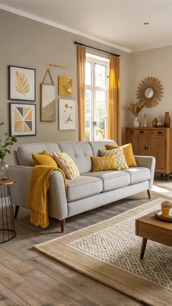 It's worth mentioning that a neutral foundation, like this lovely grey sofa, provides endless possibilities for vibrant color schemes. Here, the choice of sunny yellow instantly uplifts the whole room, creating a very inviting and cheerful atmosphere. And I've found that this combination is remarkably versatile for various styles.