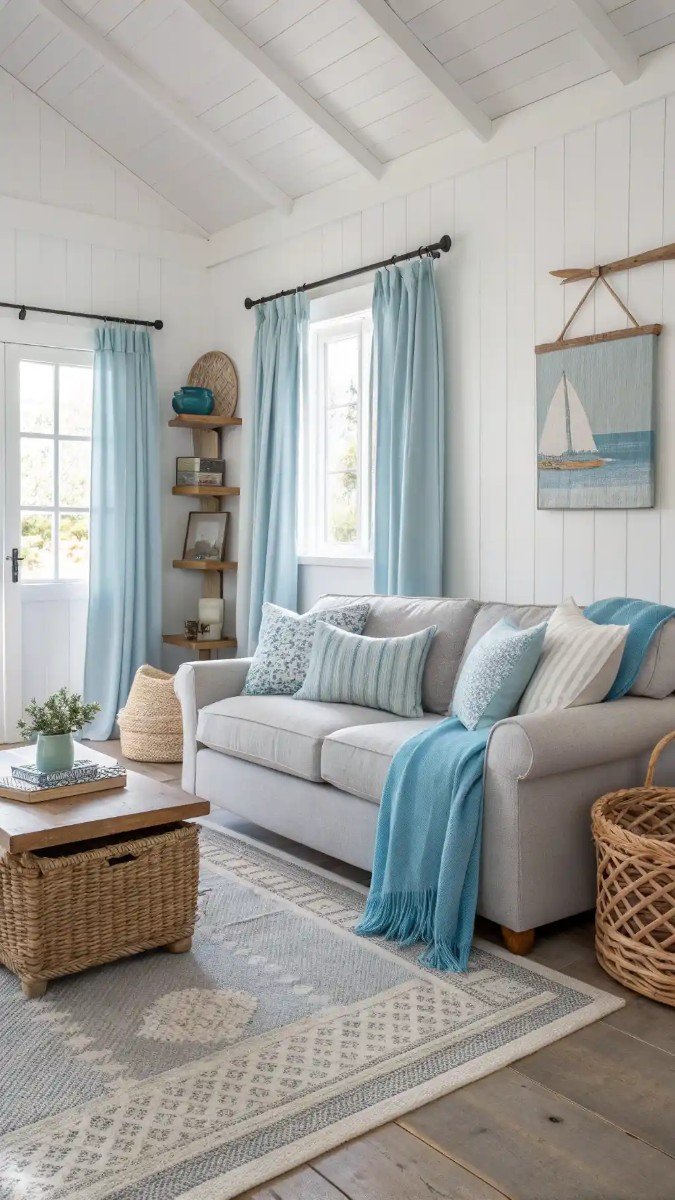Something that caught my attention is how beautifully a grey sofa anchors this serene coastal-themed living space. The soft blues and natural textures really pop against the neutral foundation, creating an inviting and airy atmosphere.