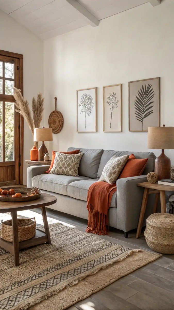 I’ve found that using burnt orange and natural wood accents, as seen here, adds incredible depth without overwhelming the calm backdrop of a grey sofa. Adding a textured rug, like this jute one, grounds the space wonderfully. And those patterned throw pillows are just the right touch of visual interest.