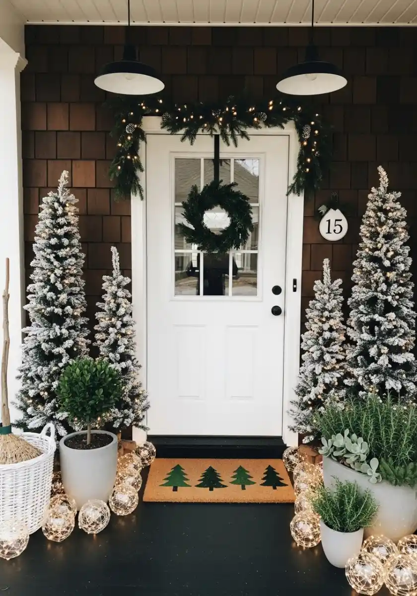 This small front porch reads woodland without shouting. Frosted pencil trees in white baskets bring height while clay pots of rosemary and succulents add that herbal, real-life smell. A plain evergreen wreath hangs on a white door and rattan orb lights scatter like pebbles along the step, so the scene glows even on dark afternoons. The palette is bark, moss, and snow, which is nerdy-satisfying because it mirrors a forest floor.