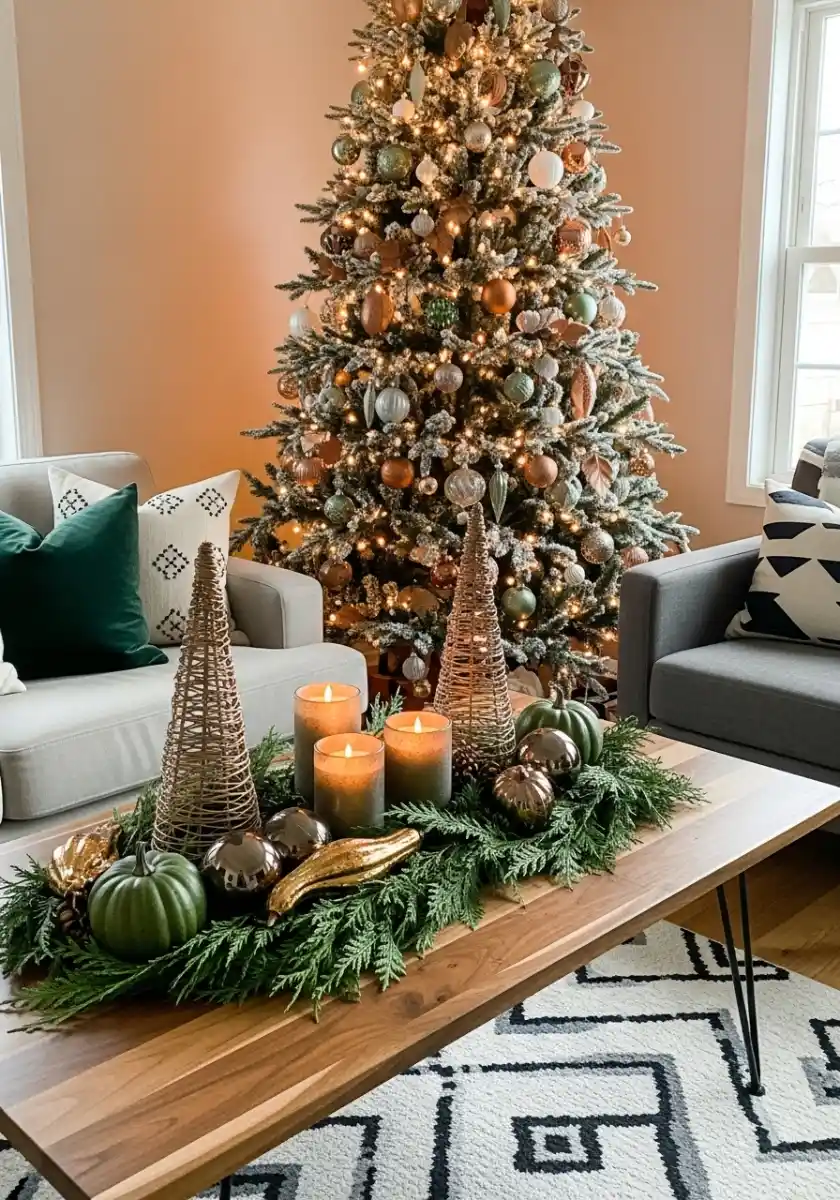 A low bed of fresh cedar runs down a walnut coffee table. On top sit matte candles, woven cone trees, bronze ornaments, pinecones, and a couple green gourds. Behind it, a big flocked tree echoes metallic greens and coppers.