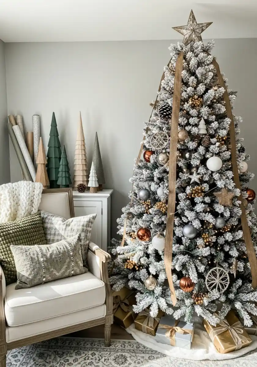 A flocked tree gets soft copper, pewter, and white ornaments with long raw-edge velvet ribbons cascading down from a star topper. Nearby, carved and felt cone trees in greens and neutrals add height and fun. Olive and stone pillows bridge the tree to the seating area.