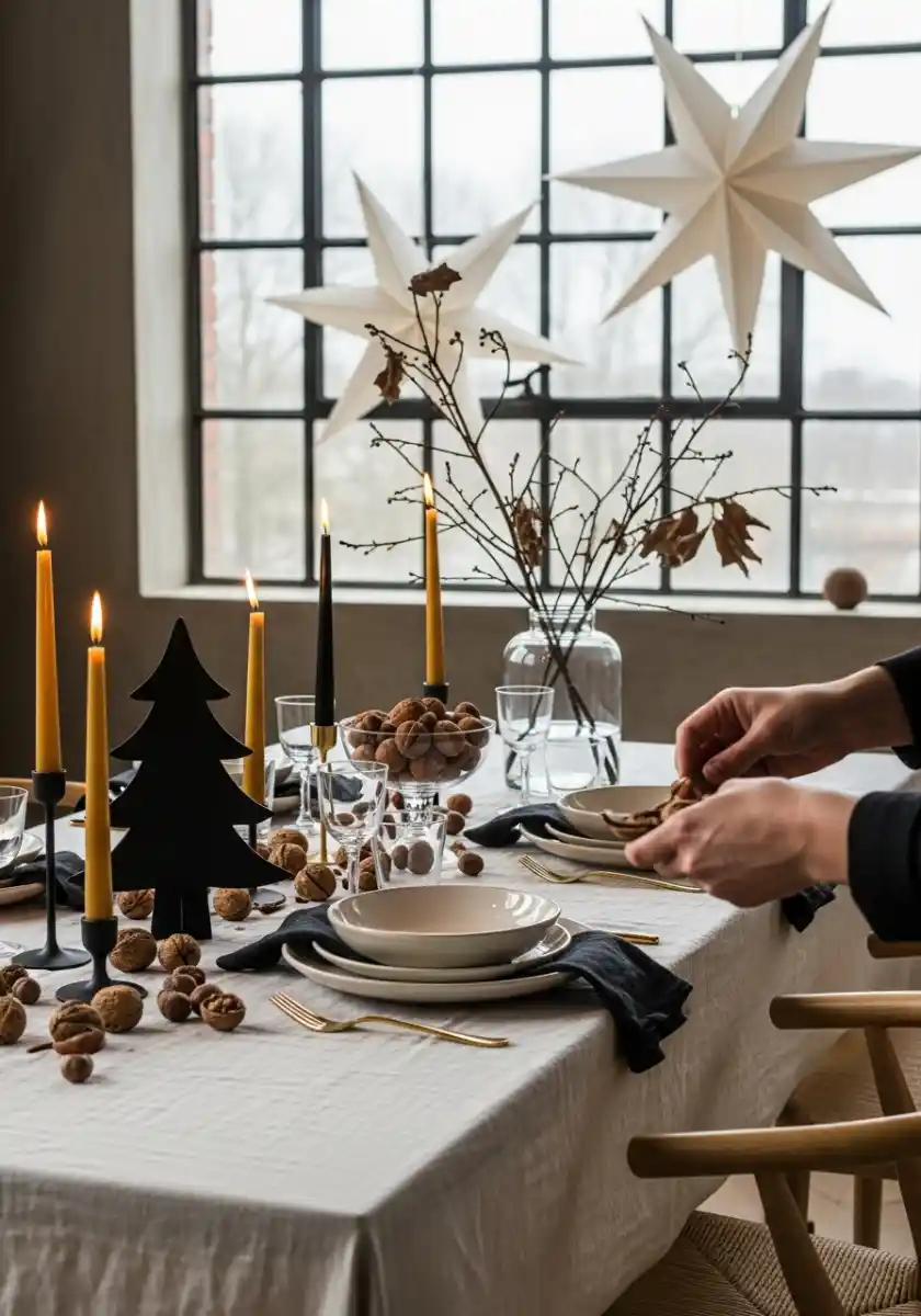 Golden and black tapers march down a linen table scattered with whole walnuts. A matte black metal tree silhouette sets the mood, and a bare branch centerpiece keeps it sculptural. Paper star lanterns float in the window like snowflakes.