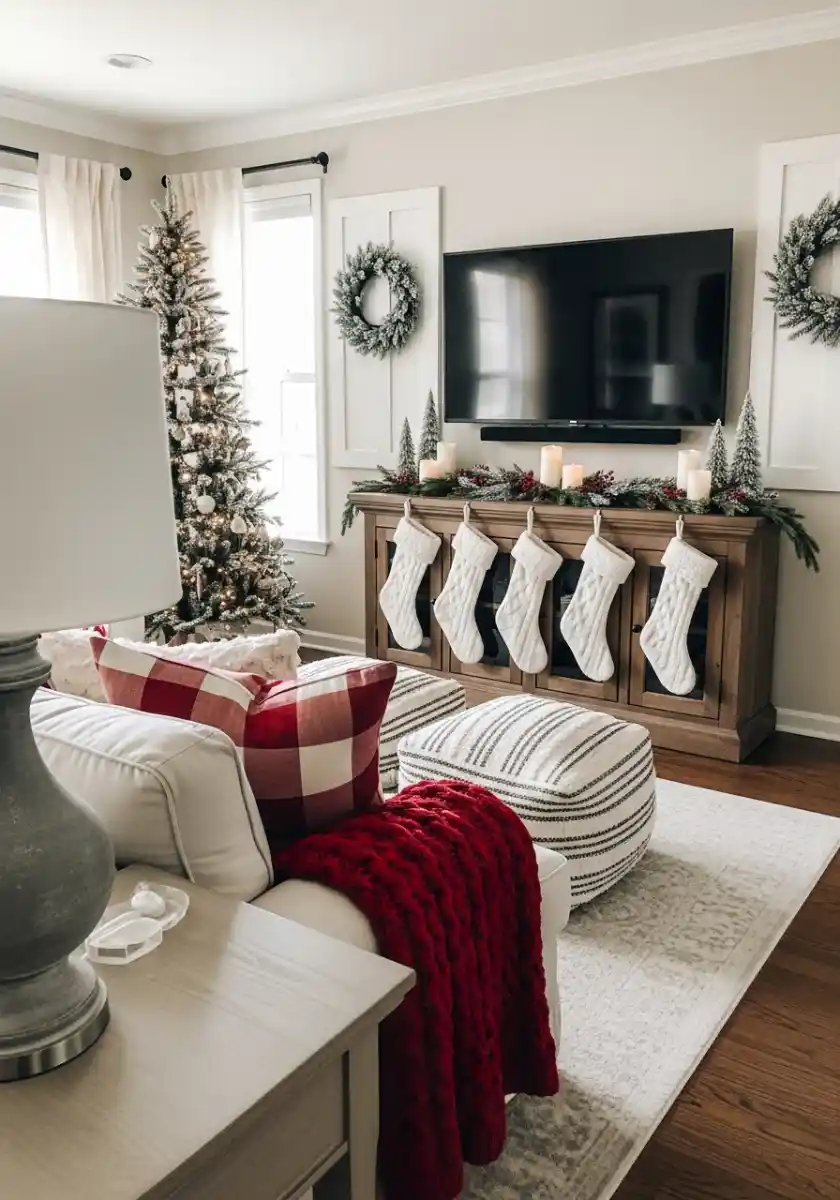 Turn a media console into a faux mantel with cedar, berry sprigs, and flameless candles. Hang five chunky white stockings in a tidy row. A buffalo-check pillow and deep red knit throw add just enough pop in a room of soft neutrals. A flocked tree glows nearby.