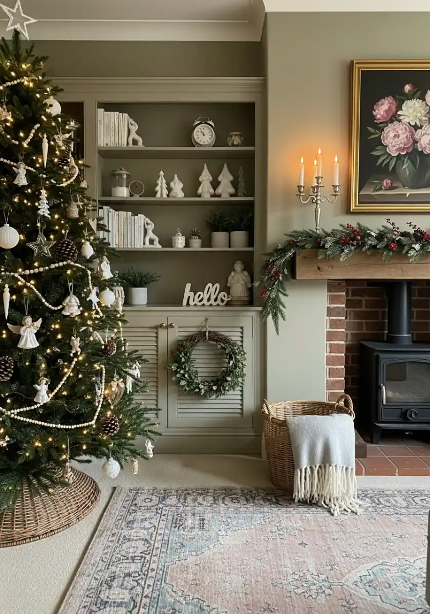 Olive built-ins and a brick hearth set the stage for an old-world garland with berries and a silver candelabra. The tree wears creamy ornaments, wood beads, and pinecones with a wicker collar that grounds it. A woven basket by the fire holds a throw for chilly mornings.