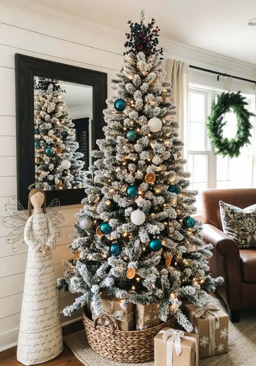 A heavily flocked tree gets glossy teal balls, white ornaments, and slices of dried orange. Kraft-wrapped gifts nestle into a woven basket base. A tall mirror doubles the glow and a folk-style angel stands nearby like a friendly guard.
