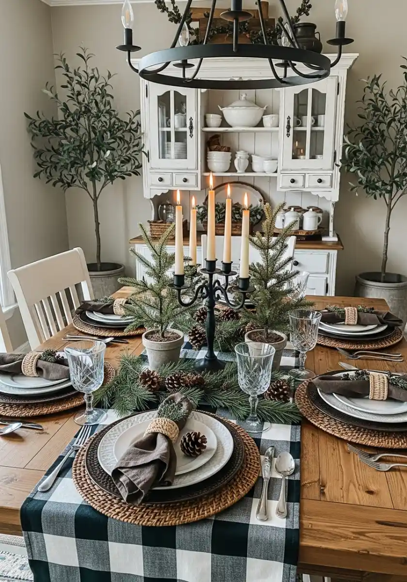 At a farmhouse table, a black-and-white buffalo check runner anchors a centerpiece of tiny potted spruces and pinecones. A wrought-iron candelabra adds height. Woven chargers, stoneware, and linen napkins with braided rings complete the tactile stack. Olive trees in the corners echo the greenery.