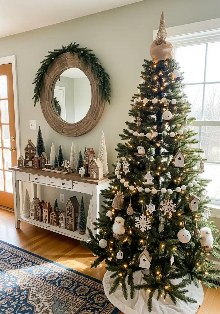 Tuck a few owl ornaments low so kids can spot them. This slightly storybook look is still very natural and belongs in the earthy christmas decor family.