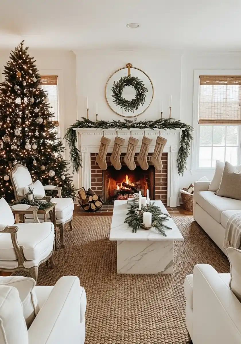 Burlap-tone stockings hang from a snow-tipped garland. A jute rug and woven shades echo the palette. White slipcovered seating keeps the room breezy while the coffee table holds a low evergreen runner and pillar candles. A round mirror crowned with a wreath mirrors the tree lights back into the room.