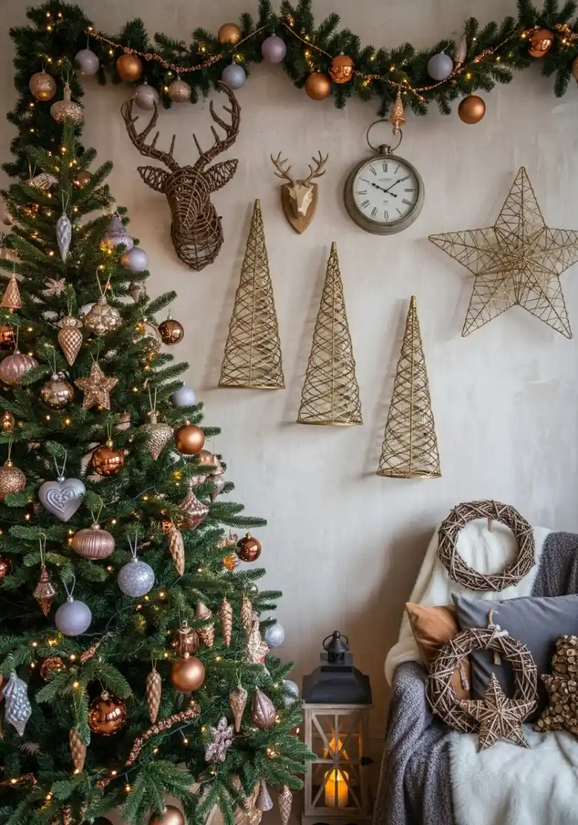 A tree dressed in copper, champagne, and pewter ornaments sits next to a wall of woven and wire art. A wicker stag head, wire star, and three cone trees create a crafty woodland backdrop. A black lantern at the base and twig wreaths on a chair finish the scene.