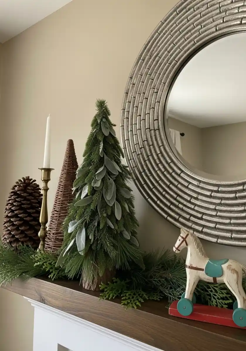 An evergreen garland gets topped with a trio of tabletop trees. There’s a woven cone, a giant pinecone, and a botanical tree layered with lamb’s ear leaves. One brass taper glints beside a vintage toy horse and a textured round mirror reflects the greens. Everything feels touchable.