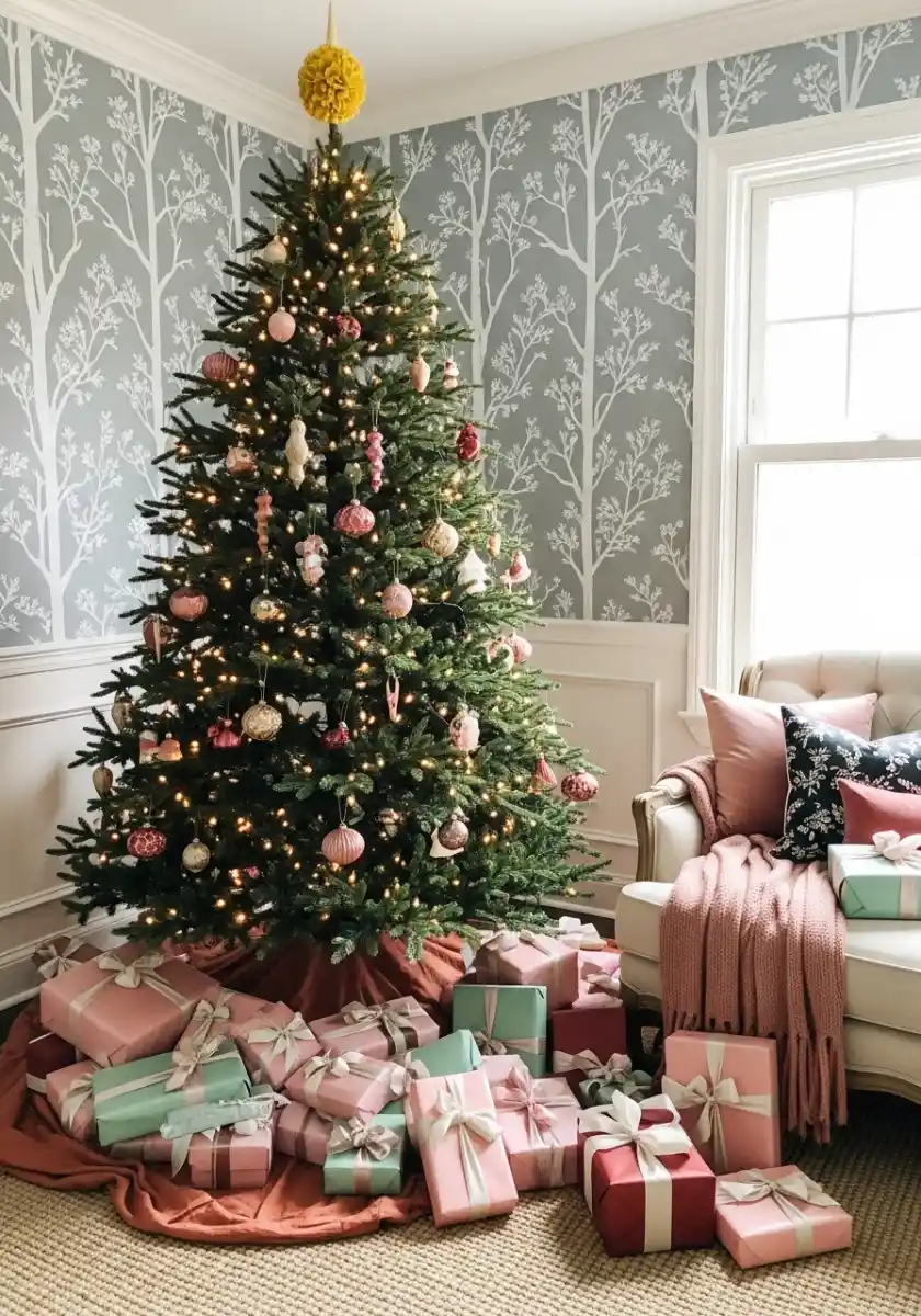 Pastel and earthy can be friends. A real evergreen twinkles with warm lights and blush ornaments. Gifts in dusty rose, clay, and sage stack on a terracotta skirt. The tones echo eucalyptus leaves and handmade pottery, so it feels grounded, not bubblegum.