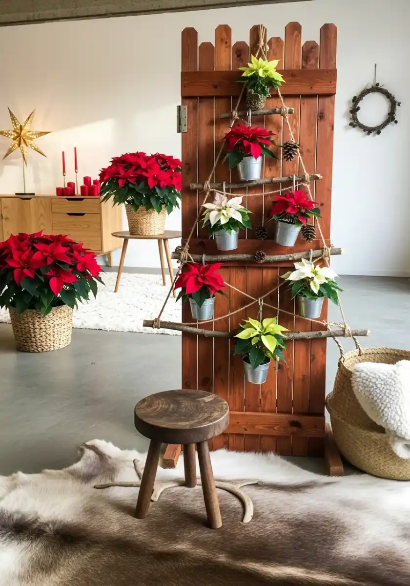 This crafty setup uses branches lashed with rope to make a hanging “tree.” Each rung holds metal pots of red and ivory poinsettias with pinecones tucked in. It’s sustainable, dramatic, and secretly easy if you can tie a knot.