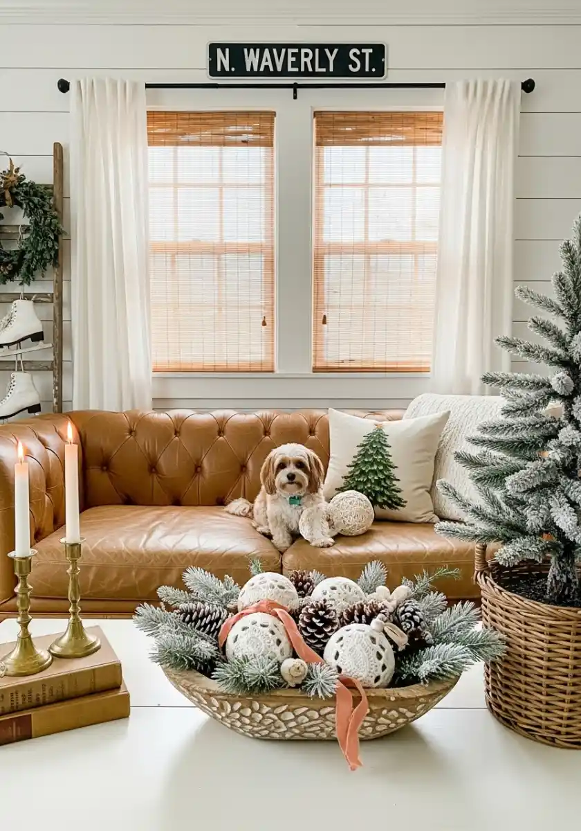A caramel leather sofa and woven accents ground the room. On the table, a carved wooden bowl is filled with frosted branches, pinecones, and jumbo crochet-covered ornaments tied with velvet ribbon. A flocked tree in a wicker collar and brass candlesticks finish the look.