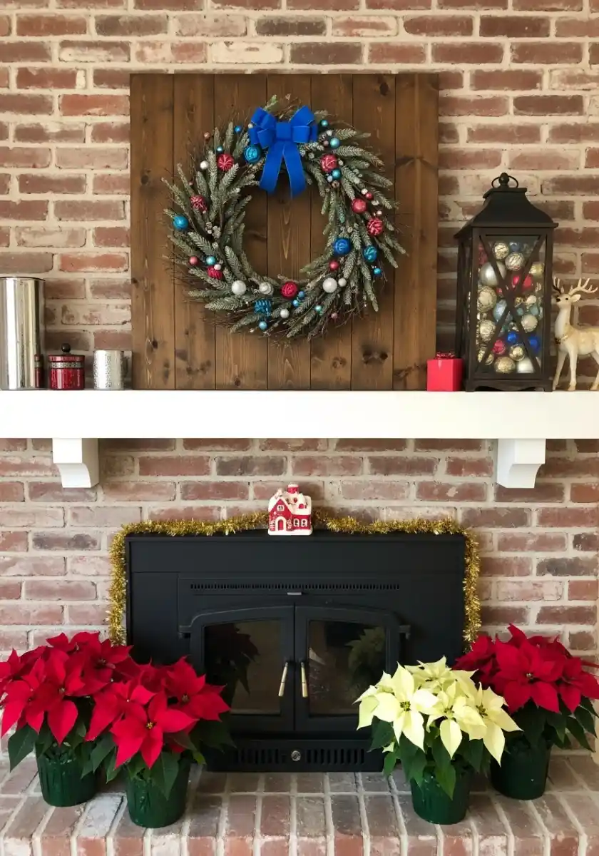 Rustic brick loves color. Here, a wood backer frames a wreath loaded with hot pink, teal, and silver baubles, plus a punchy blue bow for attitude. A lantern stuffed with more ornaments repeats the sparkle, while a tiny gold reindeer keeps things playful. Cluster red and ivory poinsettias at the hearth and wrap tinsel around your stove or screen for retro shine.